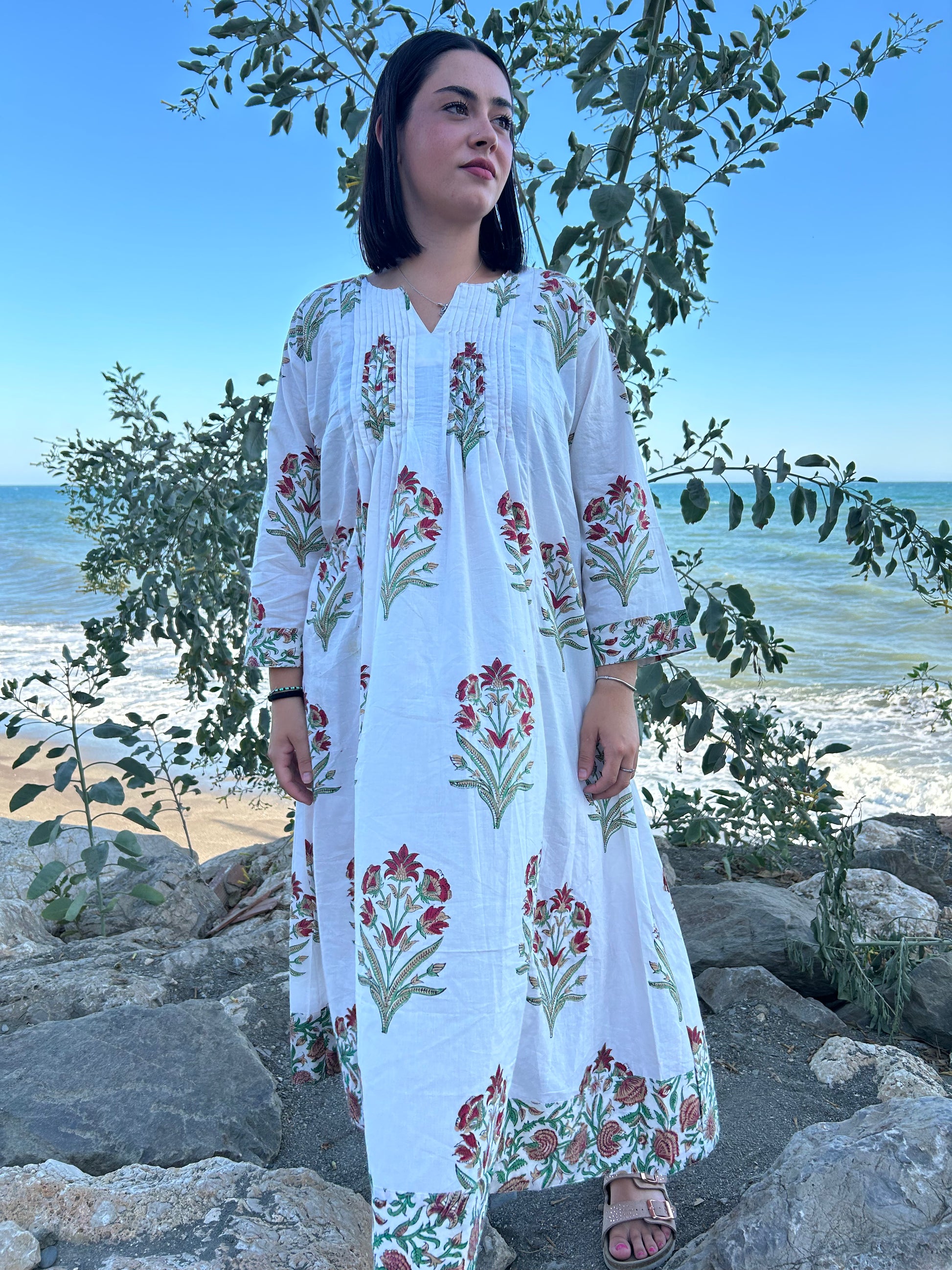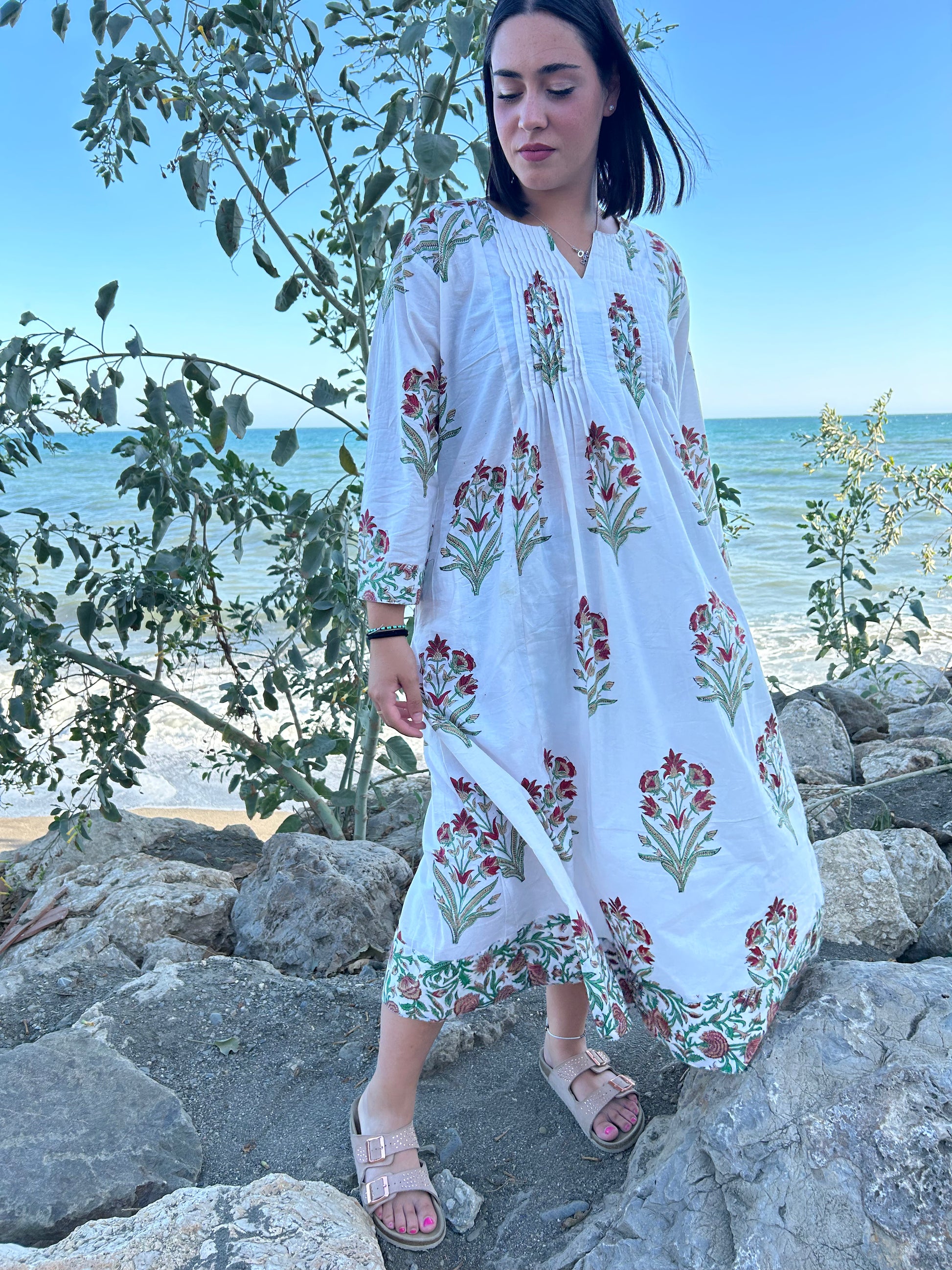 It is beautifully painted on with blocks- a traditional Indian style of printing.Each layered block by block,colour by colour, creating an exquisite design.